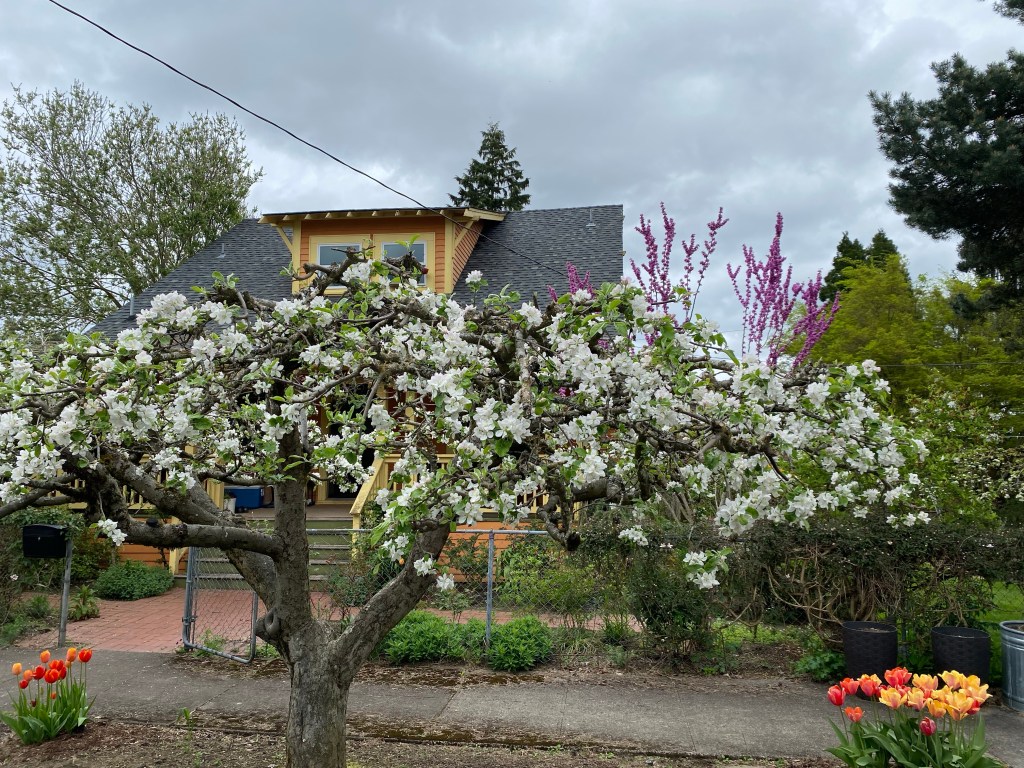 In the front yard, our apple tree is looking so happy and healthy—it always feels like a promise of good things to come.